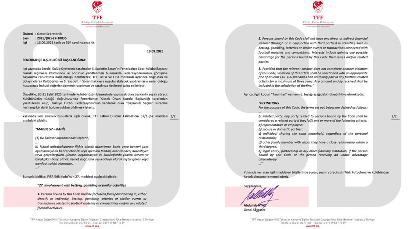 Türkiye Futbol Federasyonu, Sadettin Saran’ın Fenerbahçe başkanı seçilmesi durumunda iki sorunun aydınlatılmasını isteyen Fenerbahçe’ye yanıt gönderdi: